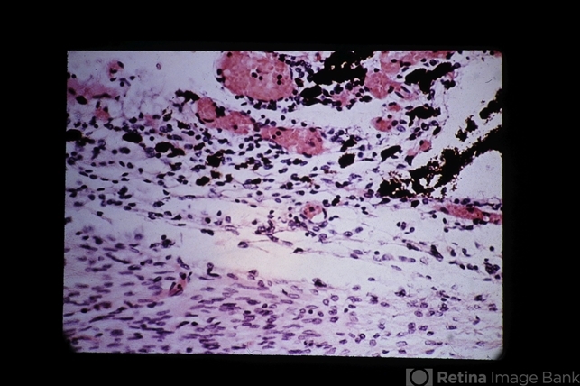 - Ciliary body showing clumps of pigment derived from necrotic ciliary pigment epithelium. Note the mild round cell infiltrate around vessels.