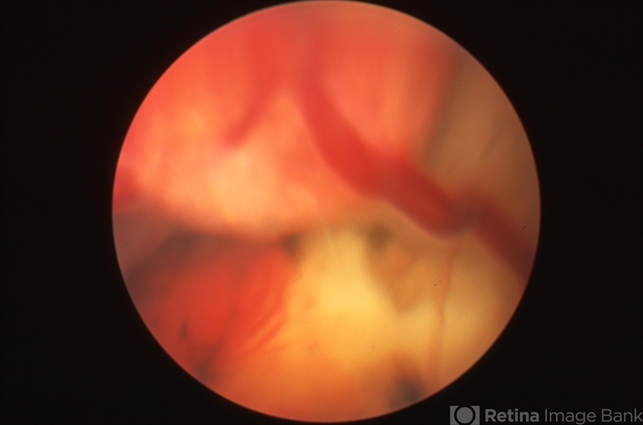 - 20-year-old patient with a peripheral retinal angioma OS and dilated feeder vessel secondary to Von Hippel-Lindau.