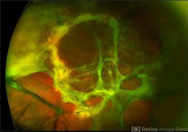 - Ultra-wide field pseudocolor image of a 57-year-old male with a chronic total retinal detachment affecting his right eye. Patient presented with klebsiella endophthalmitis in UK, and was in medically induced coma with tracheostomy. He awoke after sedation with loss of vision in both eyes, later developing a retinal detachment in both eyes. He had his first repair with gas then with silicone oil. Although he is developing band K and corneal decompensation due to oil in the AC, he has a chronic cicatricial retinal detachment with subretinal and preretinal PVR with large stretch breaks. His vision may worsen with surgery and his eye is hypotenous and if repair is possible, oil will need to be replaced and thus may still migrate to the AC thus would defer intervention until absolutely necessary given risks of vision loss in his only seeing eye. Given this is his only eye, observation is recommended at this time.