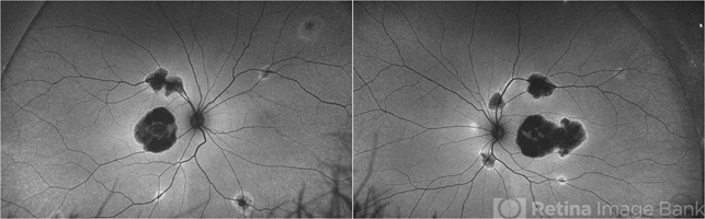 - Fundus autofluorescence pictures of a 37-year-old male with CACD. The patient has visual acuity of 1/18 in the right eye and 6/30 in the left eye. Full-field ERG was normal under photopic and scotopic conditions.