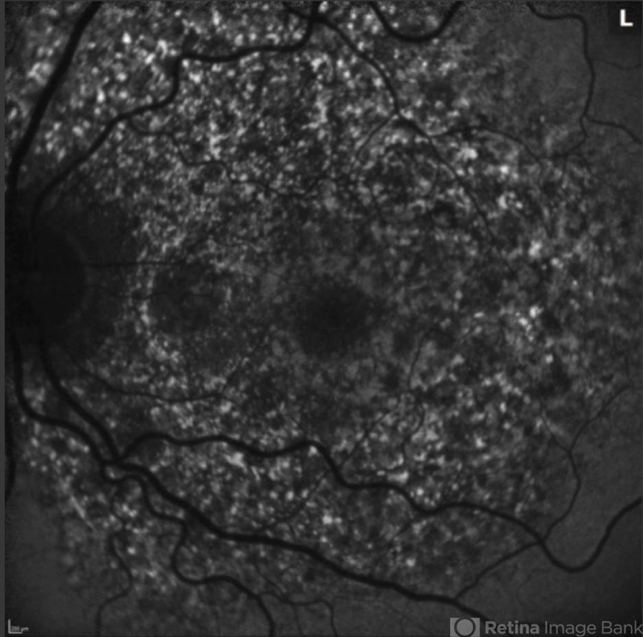 56-year-old woman with prior long term use of pentosan for cystitis. She self discontinued the pentosan 1 year ago. Imaging shows patch RPE atrophy OU with a ¾ DA patch of geo atrophy OS. Autofluorescence shows punctate hyperautoflouresence and FA shows staining of RPE mottling with reticular features.