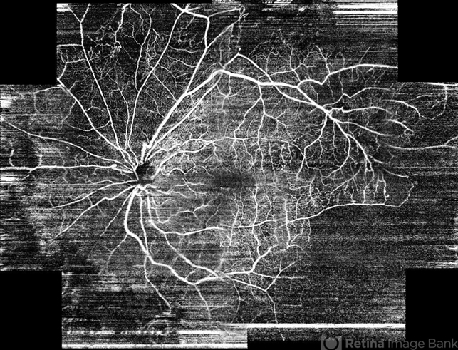 Swept source OCT angiography (montage photography) of a 62-year-old woman with proliferative diabetic retinopathy in her both eyes.