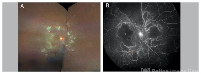 - 27-year-old woman with a history of systemic lupus erythematosus (SLE) presented with decreased vision to counting fingers at 2’ in the right eye. Funduscopic examination of the right eye (A) demonstrated retinal thickening and whitening of the macula, numerous cotton-wool spots, intra-retinal hemorrhages, sclerotic vessels, and vascular sheathing. Fluorescein angiography (B) demonstrated extensive vessel wall leakage (red asterisk) and large areas of capillary non-perfusion (white asterisk). These findings were consistent with severe vaso-occlusive retinopathy, a serious ophthalmologic manifestation of SLE. She was also diagnosed with concomitant cerebral lupus vasculitis. She was treated with intravenous methylprednisolone followed by oral prednisone taper and aspirin therapy. Mycophenolate mofetil was titrated to 1500 mg twice daily. Upon follow-up vision improved to 20/200.