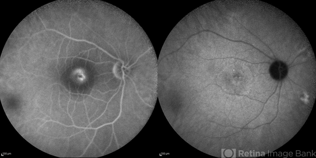 - Late FA& ICG angiography imaging of the right eye of a 50-year-old man with active chronic CSCR and BCVA of 20/100.
