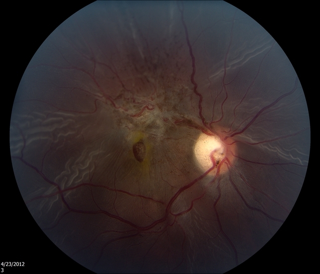 - Fundus photo of a 13-year-old boy s/p soccer ball injury 1 month previously. In addition to full-thickness macular hole and total retinal detachment with grade C PVR, note pigment granules visible in vitreous over optic nerve.